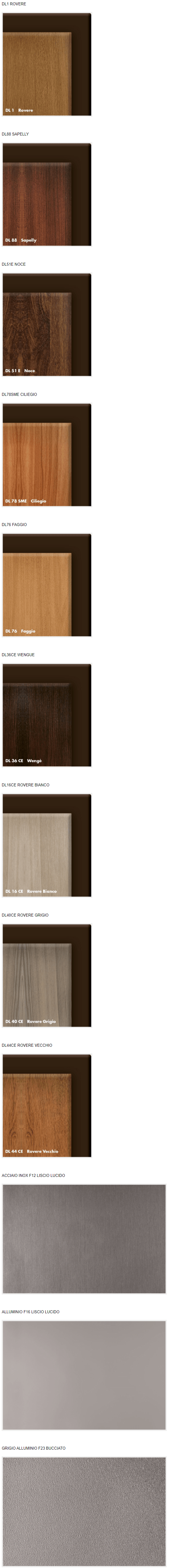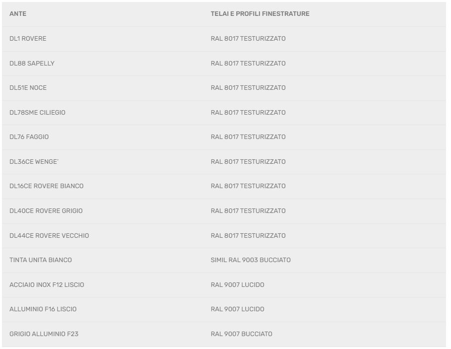 Lista dei tipi disponibili (salvo venduto o irreperibile) e combinazioni colori anta-talaio: